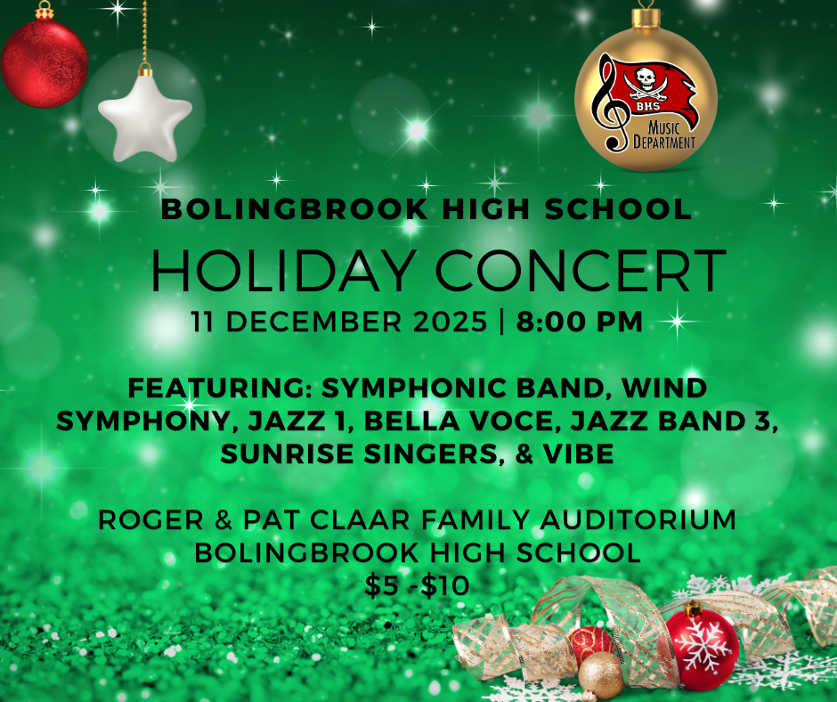 Join us for the annual Holiday Concert on 11 December 2025 at 6:00 and 8:00pm at the Roger and Pat Claar Family Auditorium in Bolingbrook High School.